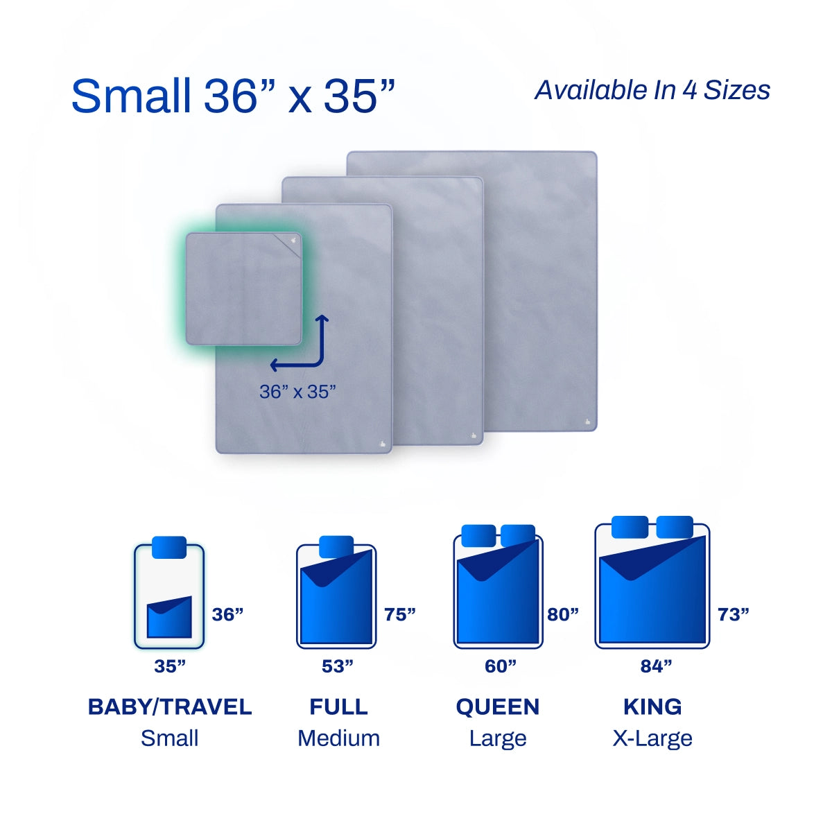 Our blankets are sized to cover the top of the mattress with no overhang to reduce both the weight and cost. Sizing specifications are as follows: Small Blanket (36" × 35"): Weight: 1.38 lbs Dimensions: 36 × 35 x .3 in Medium Blanket (75" x 53"): Weight: 4.5 lbs Dimensions: 75 × 53 x .3 in Large Blanket (80" x 60"): Weight: 5.1 lbs Dimensions: 80 x 60 x .3 in X-Large Blanket (84" × 75"): Weight: 7.3 lbs Dimensions: 84 × 75 x .3 in