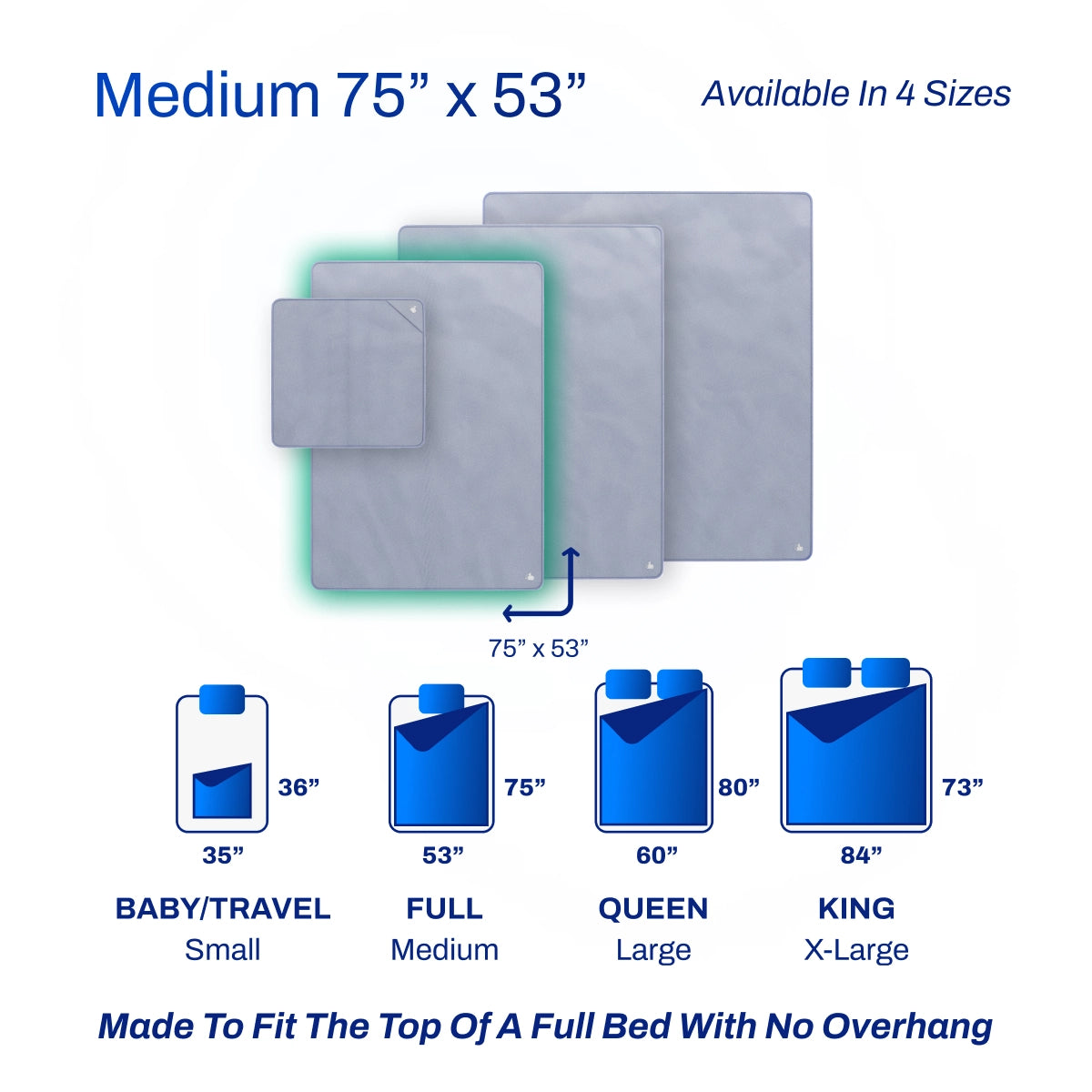 Our blankets are sized to cover the top of the mattress with no overhang to reduce both the weight and cost. Sizing specifications are as follows: Small Blanket (36" × 35"): Weight: 1.38 lbs Dimensions: 36 × 35 x .3 in Medium Blanket (75" x 53"): Weight: 4.5 lbs Dimensions: 75 × 53 x .3 in Large Blanket (80" x 60"): Weight: 5.1 lbs Dimensions: 80 x 60 x .3 in X-Large Blanket (84" × 75"): Weight: 7.3 lbs Dimensions: 84 × 75 x .3 in