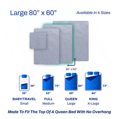 Our blankets are sized to cover the top of the mattress with no overhang to reduce both the weight and cost. Sizing specifications are as follows: Small Blanket (36" × 35"): Weight: 1.38 lbs Dimensions: 36 × 35 x .3 in Medium Blanket (75" x 53"): Weight: 4.5 lbs Dimensions: 75 × 53 x .3 in Large Blanket (80" x 60"): Weight: 5.1 lbs Dimensions: 80 x 60 x .3 in X-Large Blanket (84" × 75"): Weight: 7.3 lbs Dimensions: 84 × 75 x .3 in
