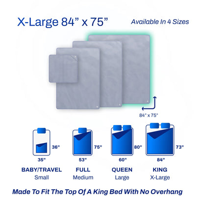 Our blankets are sized to cover the top of the mattress with no overhang to reduce both the weight and cost. Sizing specifications are as follows: Small Blanket (36" × 35"): Weight: 1.38 lbs Dimensions: 36 × 35 x .3 in Medium Blanket (75" x 53"): Weight: 4.5 lbs Dimensions: 75 × 53 x .3 in Large Blanket (80" x 60"): Weight: 5.1 lbs Dimensions: 80 x 60 x .3 in X-Large Blanket (84" × 75"): Weight: 7.3 lbs Dimensions: 84 × 75 x .3 in
