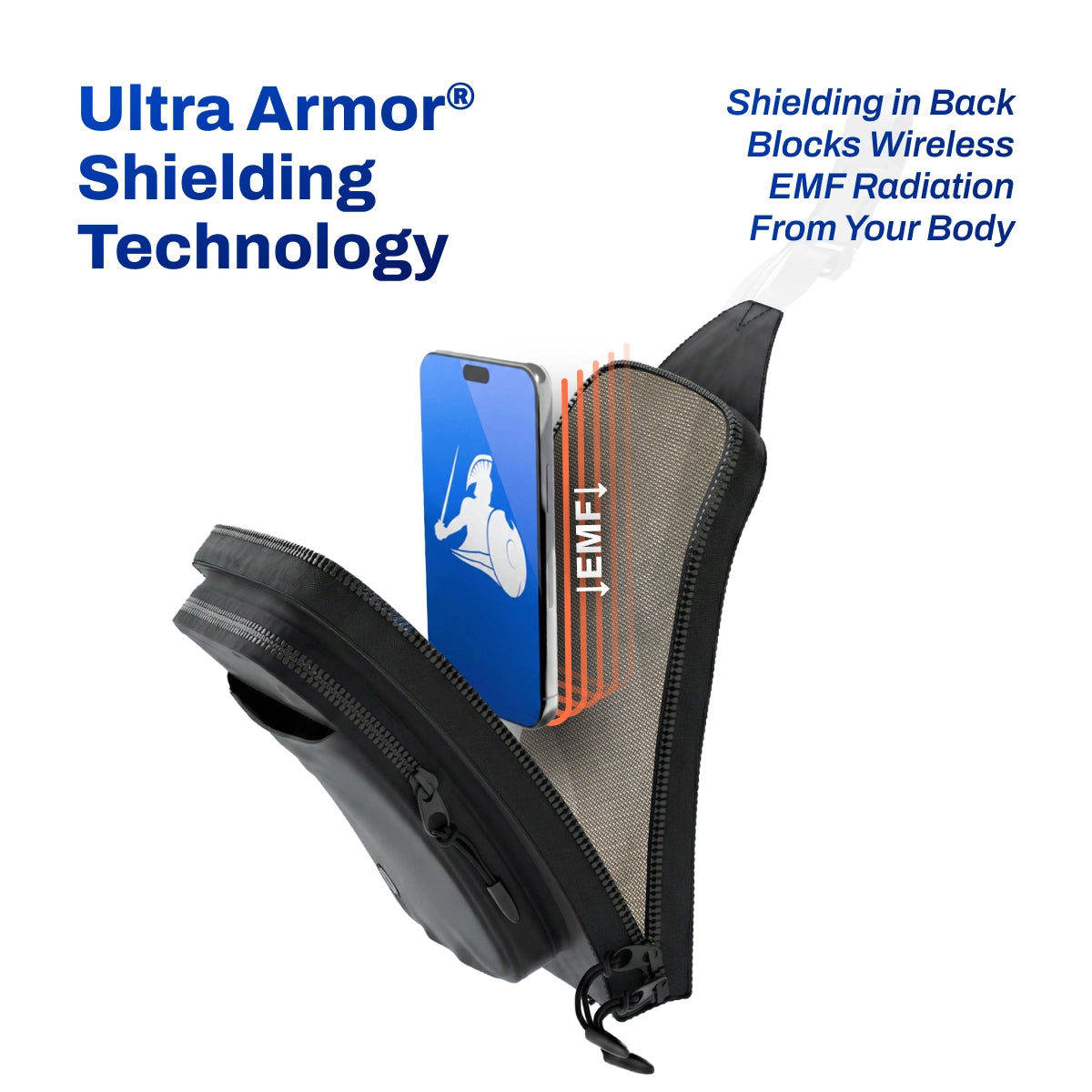 Crafted with Ultra Armor® shielding technology sewn directly into the back panel, it helps protect your body from EMF radiation emitted by smartphones, small tablets and kindles, and other smart devices. This design allows users to stay connected—receiving calls, texts, and data—while reducing body-side exposure.