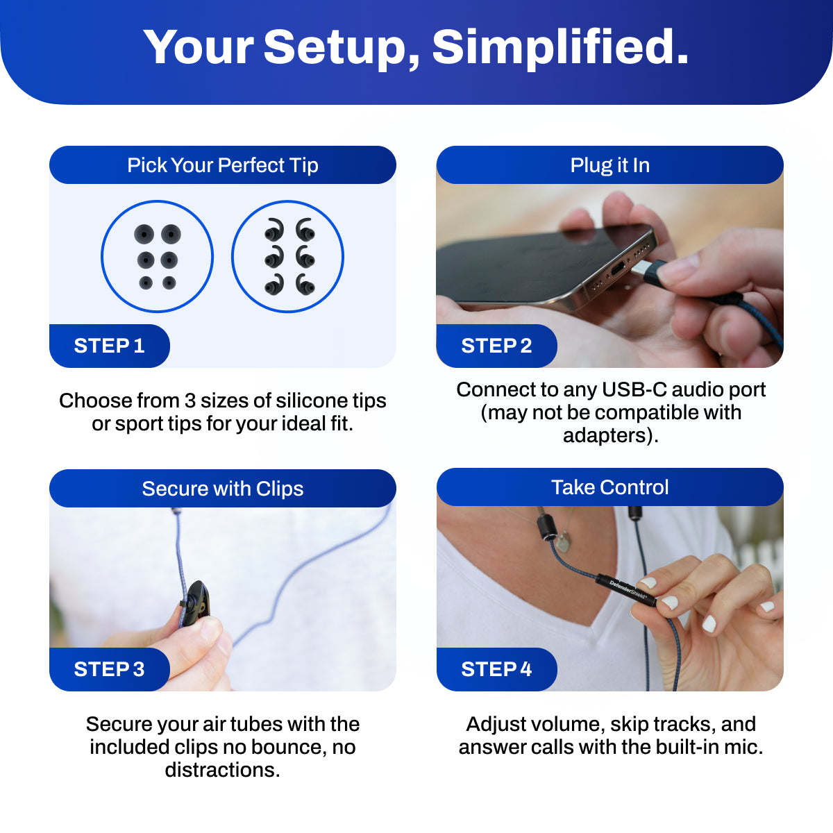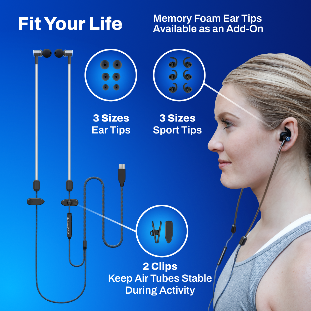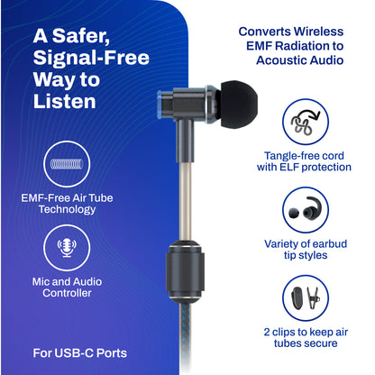 Multiple accessories are included to keep your earbuds secure while doing any activity. Choose from 3 sizes of silicone ear tips, or for a more secure fit try the 3 sizes of silicone sports tips. Place the DefenderShield® Air Tube Earbuds in your ear, and depending on your earbud model purchased, you can plug the earbuds into the appropriate 3.5 mm or USB-C port on your devices. It is the perfect accessory to go with our superior EMF Radiation Protection Phone, Laptop, and Tablet Cases! Make sure to have the appropriate adapter for cell phones without audio ports.