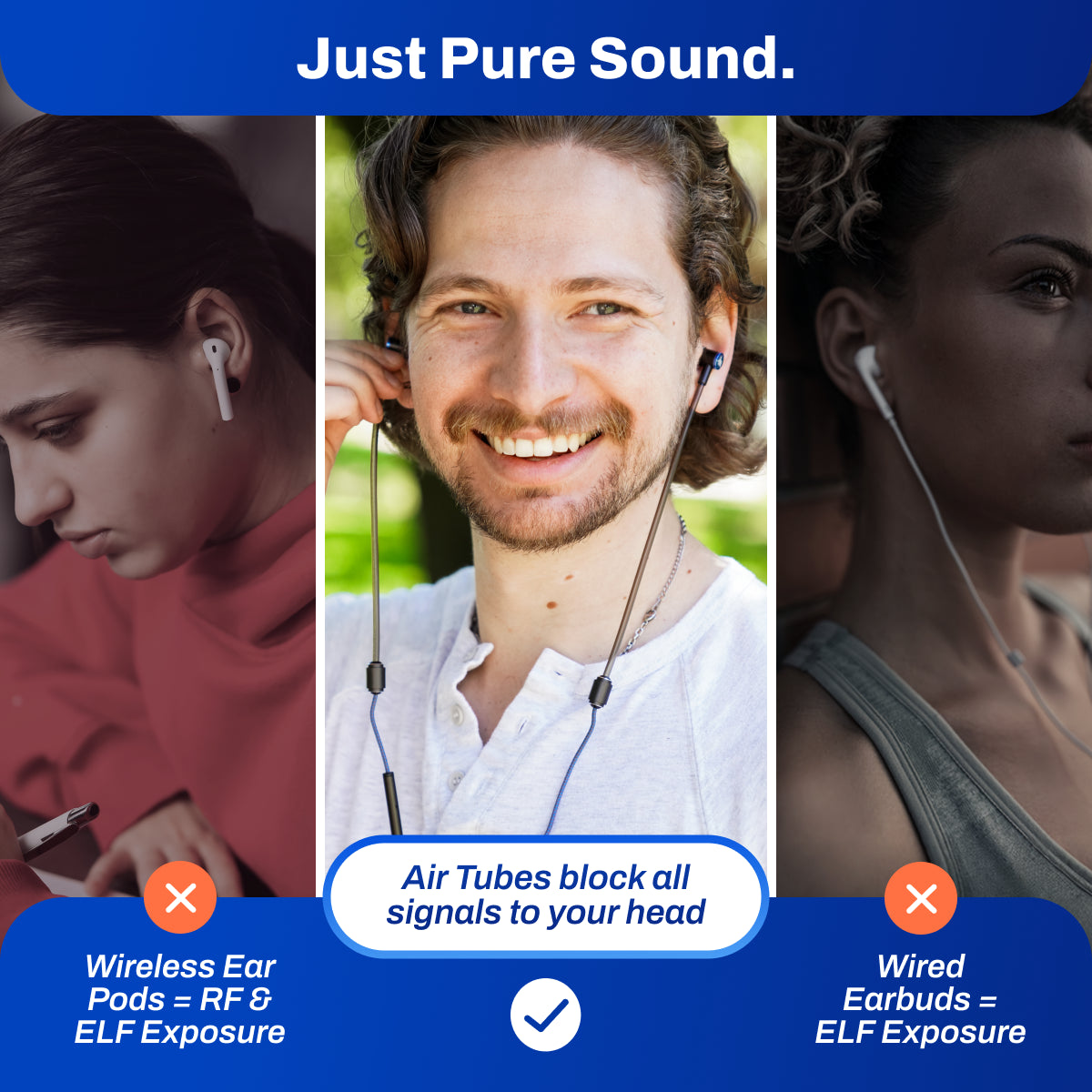 The DefenderShield® Radiation-Free Earbuds are built with professional-grade stereo quality speakers, while air tubes increase space for audio development, producing more body and delivering superior acoustic sound.